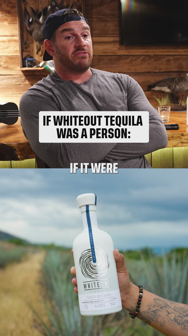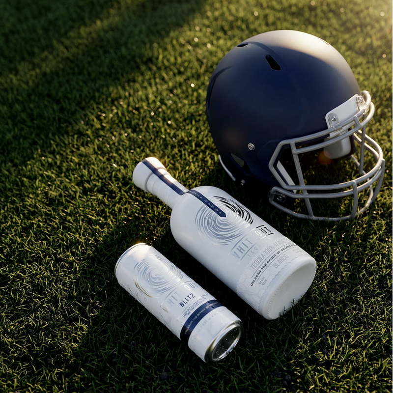 Whiteout tequila bottle on a golf course with a golfer in the background